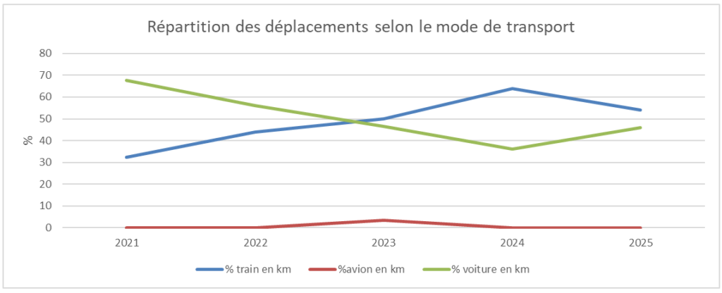 L’impact essentiel de l’activité est lié aux déplacements. Des indicateurs sont calculés depuis plusieurs années pour suivre l’évaluation des déplacements et des émissions de CO2 liées.